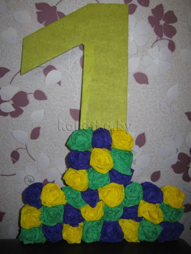 Важно! Все эти материалы используют для того, чтобы обернуть основу, однако с их помощью можно придать фигуре дополнительный объем. Для этого необходимо сделать цветы из гофрированной бумаги для цифры. Они могут быть с торчащими лепестками или в виде пушистых помпончиков, к которым могут быть добавлены разные бантики и “фунтики”.