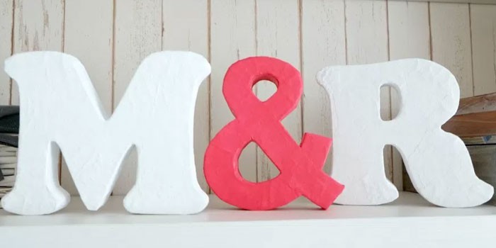 Объемные буквы из картона и салфеток отлично подойдут в качестве декора на свадебной фотосессии.