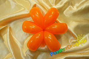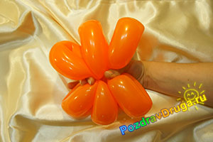 Шарик нужно брать продолговатой формы. Надуваем шарик и завязываем на конце, оставив 3 см. Соединяем шарик в кольцо и сгибаем по середине. У нас получится 2 «сосиски». Делим каждую из них на три части, скручивая в каждой точке деления обе части. Складываем их в гармошку, перекручивая в одной точке. Получились «лепестки» цветка.