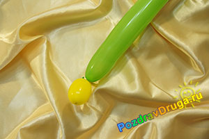 Зеленый шар надувайте до конца, но не слишком плотно, чтобы манипуляции по перекручиванию не стали причиной его порчи. От завязанного узелка отступить 10 см, согните и перекрутите шар так, чтобы узел расположился в месте перекручивания. Стебель вставьте в середину цветка.