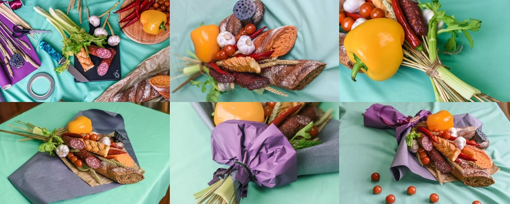 Колбасные букеты станут украшением любого стола. Для их изготовления используются все виды колбас в целом виде и нарезанные. Украшают комбинации сырыми овощами, ломтиками сыра, зеленью.