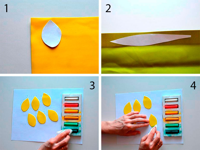 Используйте сухую пастель для тонирования лепестковых кругов (по цвету краска должна быть потемнее фома). Тонируйте полностью и с двух сторон, слегка прикасаясь к деталям.