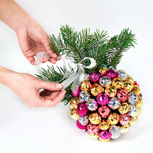 Возьмите картон, с помощью карандаша и циркуля начертите на нем окружность с размером вашего будущего букета. Далее, отступите внутрь семь сантиметров и прочертите еще одну окружность. Вырежьте готовый «бублик» и обмотайте его красной лентой. Возьмите шоколадные яйца и оберните их в подарочную блестящую упаковку. Нагрейте пистолет и готовые съедобные елочные игрушки, приклейте их по периметру каркаса на расстоянии 15-20 см друг от друга. Расстояния между Киндерами заполните елочными веточками. Далее, займемся самим букетом. Возьмите соломки. К каждой привяжите за хвостик один конфето-бутон. Таких съедобный цветов нужно сделать столько, чтобы заполнить центр окружности. Когда букет сформирован, перевяжите его красивой атласной лентой и поместите в сердцевину каркаса. Съедобный подарок готов!