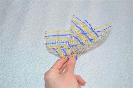 Очень красивые цветы с серединками из «Киндеров» можно сделать из капрона на проволочном каркасе. В этом случае каждый лепесток получается легким и полупрозрачным и в то же время прочным, так как по контуру имеет основу из проволоки.
