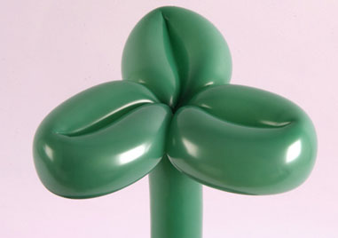 При помощи насоса надуйте воздушный шар так, чтобы остался кончик не менее 3 см. Свяжите начало и конец шара двумя узлами. Согните конструкцию пополам и перекрутите посередине два раза. Разделите шар на три равные части и перекрутите в двух местах. Сложите гармошку и возьмите ее указательным и большим пальцем в местах перекручивания. Правой рукой перекрутите три лепестка. На этом создание цветка заканчивается и самое время перейти к стебельку.