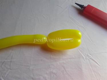 2)Жёлтый шарик визуально делим на пять частей, и скручиваем два пузыря длиной примерно в 10 см, закрепляем их в петлю.