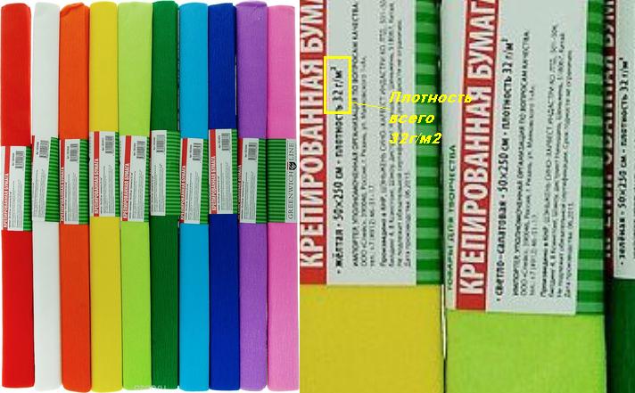 Бумага для творчества и упаковки подарков: плотность 30–50 гр, мелкие складки, высота которых не регламентируется. Для флористики мало подходит, поскольку плохо растягивается, рвется и от клея размокает.