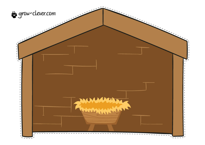 Вертеп из картона сделаем по выкройке-шаблону. Хлев и героев распечатаем на принтере, наклеим на плотную бумагу и раскрасим.