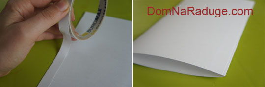- складываем бумагу пополам, а свободные края при помощи скотча фиксируем изнутри (совет: если есть возможность воспользоваться декоративным скотчем со специальным узором, то возьмите его: это поможет склеить края с внутренней и обратной стороны, не испортив при этом внешний вид изделия);