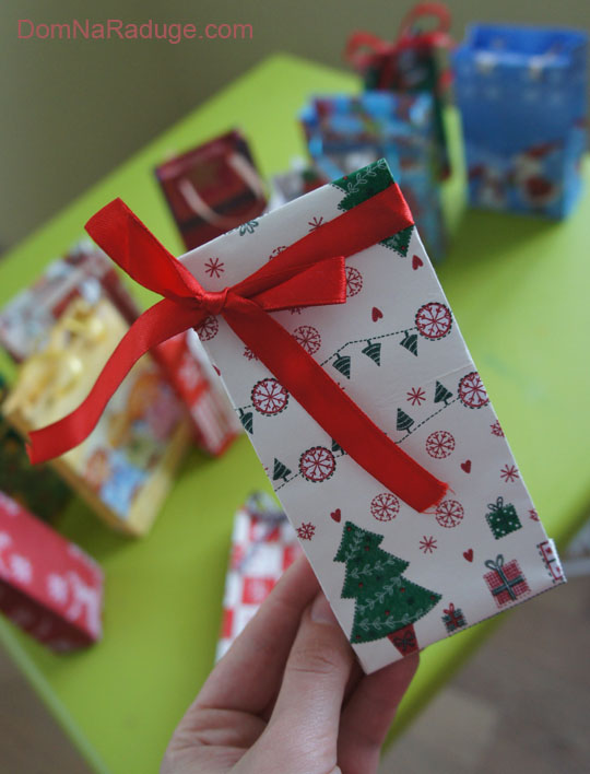 - оборачиваем подарок бумагой, склеивая края скотчем, оставляя 1 сторону свободной;