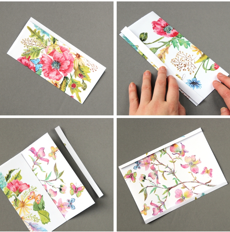 - Возьмите еще один кусок узорчатой бумаги, сложите и обрежьте в половину листа.