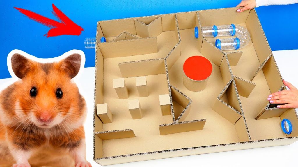 Коробки также отлично подойдут для создания крысиного лабиринта. В коробках разной величины прорезают входы и выходы и складывают их друг на друга. Чтобы сделать такую конструкцию более устойчивой, коробки между собой скрепляют двусторонним скотчем.