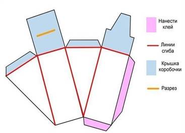 - С помощью не пишущей пасты или линейки сделать сгибы по пунктирным линиям. У нижней части торта сгибы расположены наружу, у верхней – внутрь.