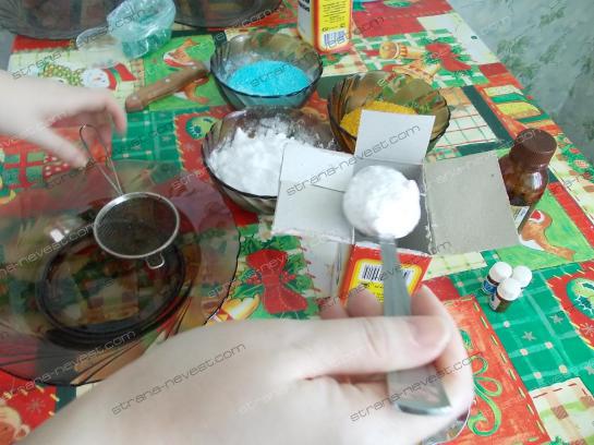 - Сперва нам необходимо смешать три компонента в сухом виде: пищевую соду, лимонную кислоту и сульфат магния (известного также как английская соль, продается в аптеках). Тщательно размешиваем полученную массу до однородной, чтобы не было ни одного комочка.