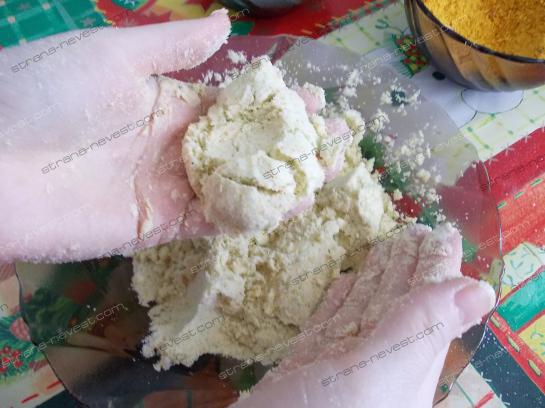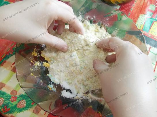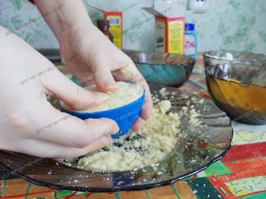 - Тщательно размешиваем руками смесь до однородной массы. Если вы знаток в кулинарии, то вы почувствуете как консистенция получится приближенной к песочному тесту.