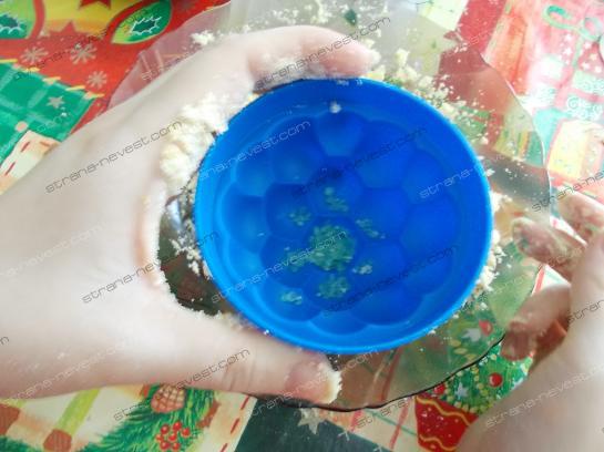 - Теперь нам нужно, чтобы будущая ванная бомбочка затвердела. Для этого помещаем форму в холодильник до полного застывания, либо помещаем в морозильную камеру. Как правило, для этого 20-30 минут вполне достаточно.