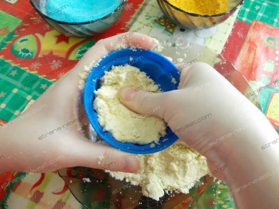 - Добавляем воды и тщательно перемешиваем. Не пугайтесь, когда масса начнет слегка пениться и увеличиваться, началась реакция. Как определить, что масса такая как надо? Очень просто — сожмите ее в кулаке, и если она не рассыпается — вы добились плотной консистенции.