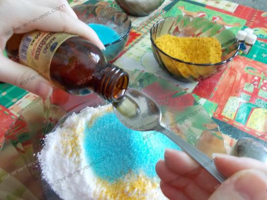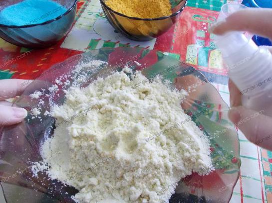 Затем смесь разделяют на несколько частей и в каждую добавляют капельку косметического или пищевого красителя. Все хорошенько смешивают, чтобы добиться однородного цвета.