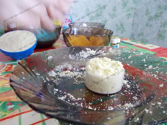 Теперь о наполнителе. Категорически не рекомедую брать глину. В сухом виде она имеет довольно красивый цвет, но в воде, да еще с маслом, получается просто серая жирная вода. Бррр! Картофельный крахмал также попадает в черный список. Кукурузный крахмал, как и сухое молоко, также делает воду мутной, но от них пользы больше, кожа становится нежной и мягкой. Можно использовать перемолотую овсянку, сахар и прочее. Простор для полета фантазии просто огромный.