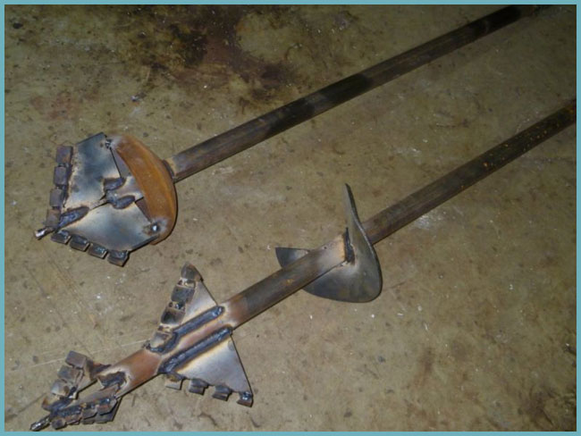 Шнековая буровая установка своими руками строится вокруг главного рабочего элемента — бура. Чтобы его изготовить следует воспользоваться стальной трубой 10 см с диаметре. На верхнем конце трубы обустраивается наружная винтовая резьба. Противоположный конец снабжается шнековым винтом, диаметр которого приблизительно равен 20 см. Можно ограничится одним — двумя витками в шнеке. На концы шнека приваривают пару ножей из стали так, чтобы при установке трубы в вертикальное положение между ними и горизонтальной поверхностью был угол.