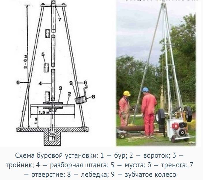 Буровая установка состоит из: 1 – бура; 2 – воротка; 3 – тройника; 4 – разборной штанги; 5 – муфты; б – треноги; 7 – отверстия; 8 – лебедки; 9 – зубчатого колеса.