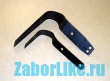 От полосы металла шириной 5 см он отрезал две одинаковые полосы и сделал угловые скосы, отступив от конца полосы на 2 см. Для полос можно использовать старые автомобильные рессоры.