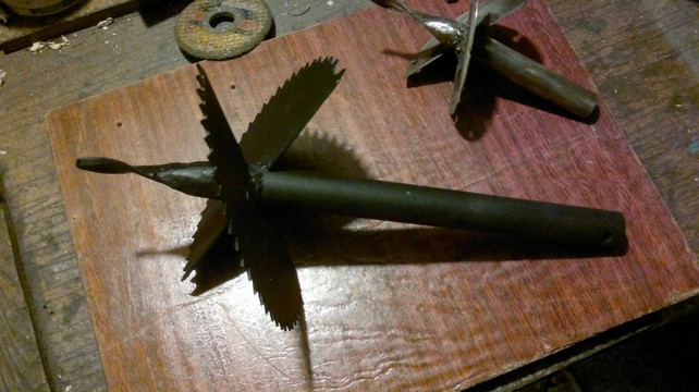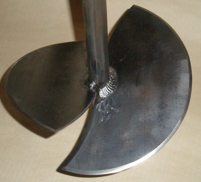 - Половинки стального диска приварить к вертикальной штанге на расстоянии 125 мм от заостренного конца с противоположных сторон под углом 70° к ее продольной оси. Таким образом, угол между ними должен составлять 40°.