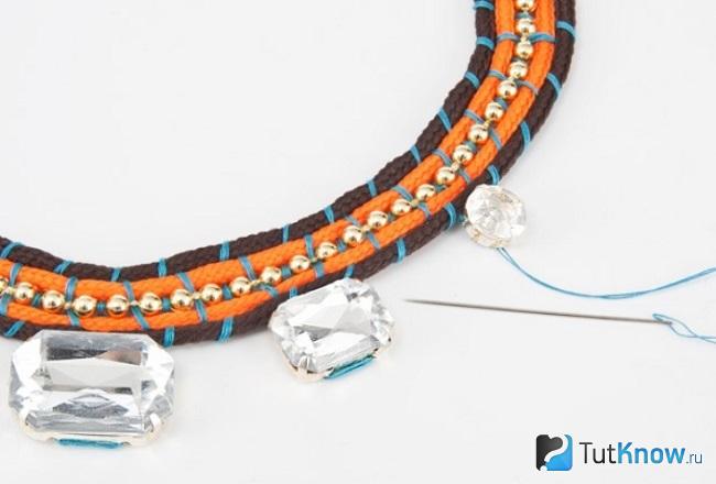 Сшейте шнурки между собой, чтобы получилась довольно широкая полоска колье. Приклейте камушки, пришейте застежку.