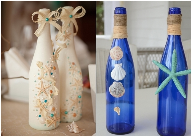 Используйте для украшения бутылки ракушки разных цветов, размеров и форм. Очень красиво смотрятся на бутылке морские звезды и веточки кораллов.