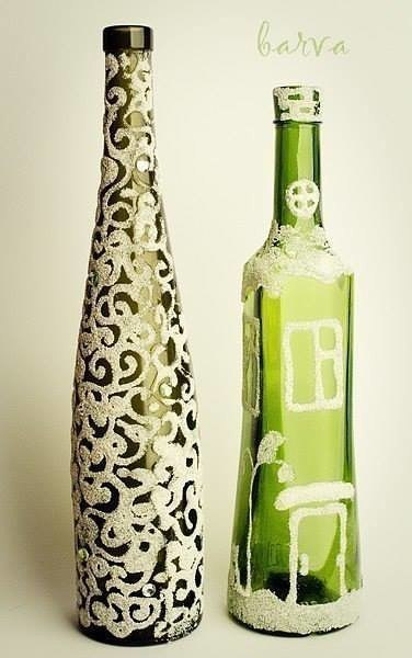 На окрашенную бутылку можно нанести рисунок с помощью трафаретов или просто «от руки», наклеить кружево, создать фактуру при помощи капелек клея, наклеить декоративные элементы – цветы, бусины, стразы, кусочки цветного стекла, блестки.