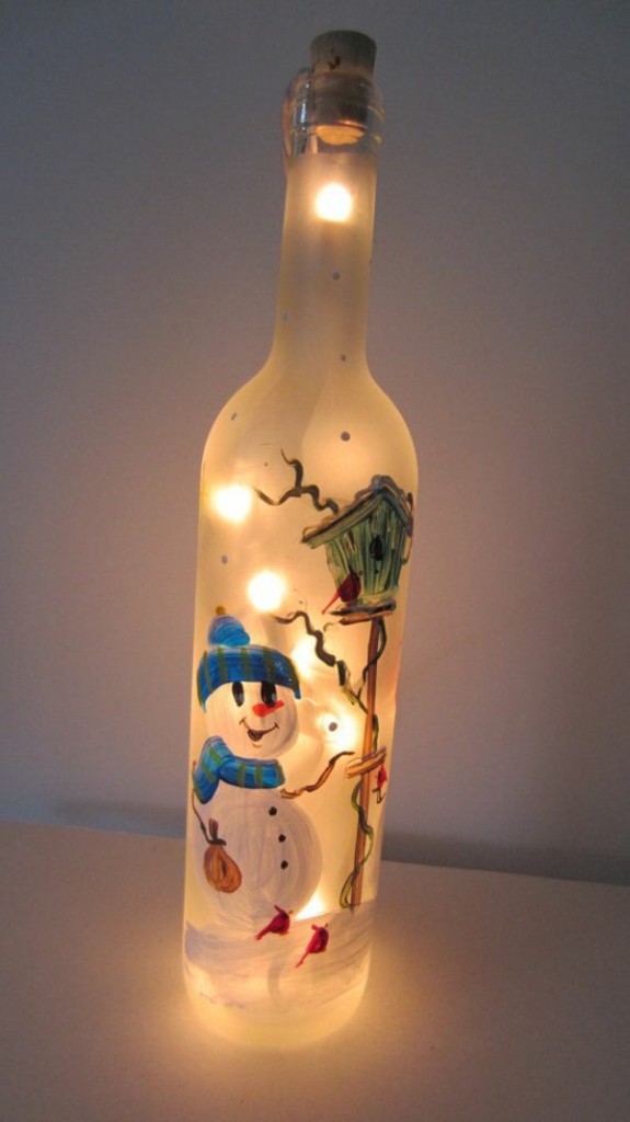 Оформленная в зимнем, новогоднем стиле бутылка, может стать как украшением торжественного стола, так и частью декора помещения, в котором будут отмечаться праздники. Это может быть как самое простое окрашивание бутылки в белый цвет и покрытие при помощи крупномолотой соли в качестве имитации снежной поверхности, так и роспись изделия на манер узоров, которые оставляет мороз на окнах.