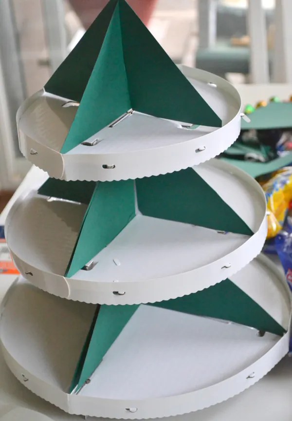 Если вам кажется, что отдирать конфеты от елки-десерта неудобно, но сама идея нравится, попробуйте альтернативный вариант – бумажная елка в качестве подставки с полочками, куда складываются конфеты.