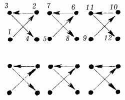- 2-й ряд: Сделать так, как показано на схеме, соединить точки, чтобы получился шахматный ход относительно соединений точек в верхнем ряду.