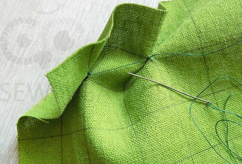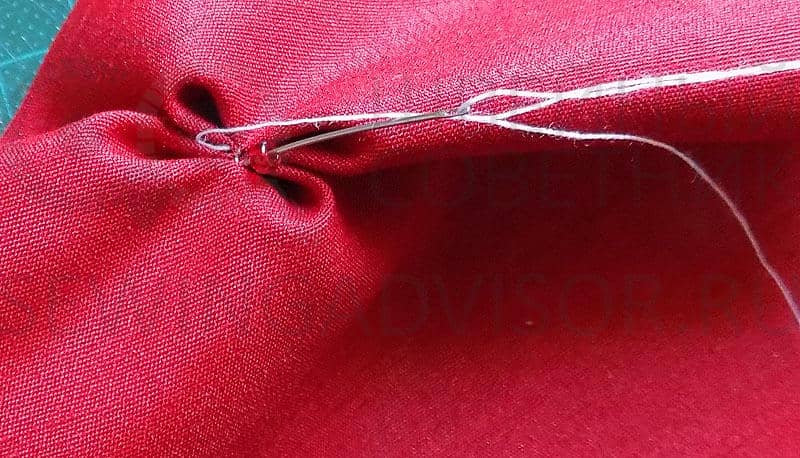 Далее, надо туго натянуть нить, чтобы складочки «стояли» и при этом их можно было сдвинуть к центру. Каждые два конца нитки завязываются в крепкий узелок. Потом делается следующий прокол под отправной точкой. Ряды делаются зигзагообразными. Нитка вновь натягивается, делаются узлы.