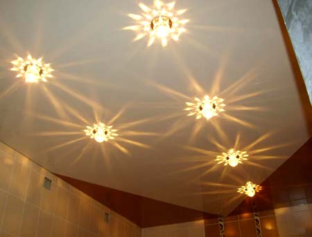 Для отделки потолка необходимо использовать влагоустойчивые материалы. Существует несколько вариантов практичного и не слишком дорогого обустройства потолка в ванной комнате. Это установка натяжного потолка из пластика или пластиковых панелей. Преимуществом данного вида отделки является незначительное уменьшение высоты помещения и возможность установки встроенных светильников. Более затратным вариантом будет установка подвесного потолка, но смотрится он гораздо более эстетично и элегантно, чем предыдущие варианты. В него можно вмонтировать осветительные приборы, спрятать под ним проводку. Недостатком можно считать то, что подвесной потолок существенно уменьшает высоту комнаты (15-20 см).