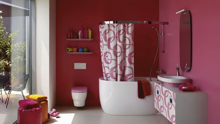 Из-за красного цвета освещение в комнате стало более мягким и комфортным. Белый цвет пластиковой облицовки хорошо сочетается с любыми зеркалами и стеклом.