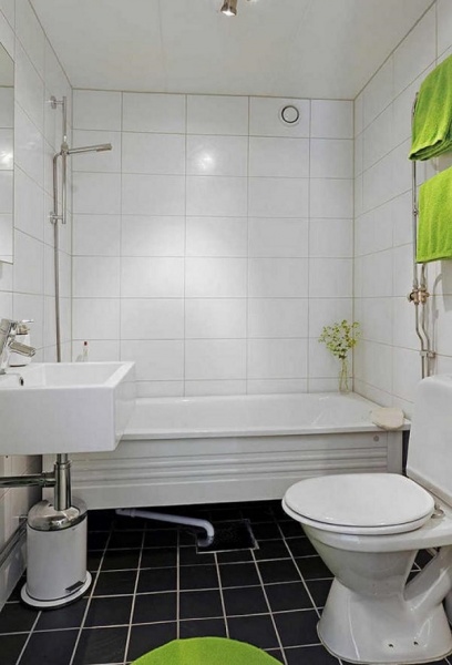 Общая тональность ванной комнаты выполнена в белых и сине-зеленых цветах. Чтобы немного разнообразить цветовую гамму, на пол можно уложить плитку разных цветов, например, красную и зеленую.