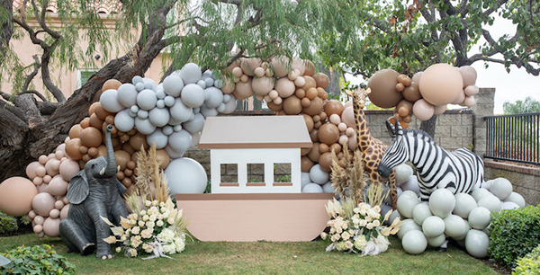 Опытные декораторы рекомендуют не использовать слишком яркие оттенки, чтобы на фоне фотозоны не потерялись наряды гостей. Подходящей цветовой гаммой будут обладать шары бледно-розового, золотистого, серебристого, голубого, персикового, бежевого или белого. Для детских праздников целесообразно создавать композиции в виде фигурок любимых героев из мультфильмов. Их можно выпилить из фанеры или картона, а потом украсить латексными или фольгированными шарами.