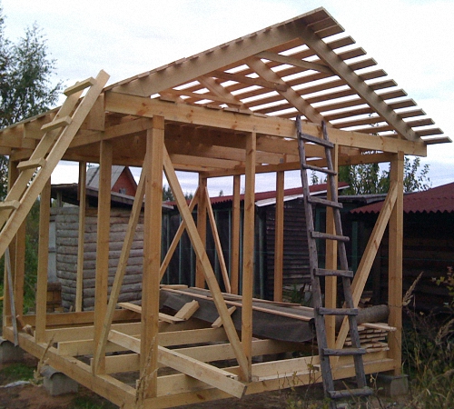Для монтажа каркаса необходимы стойки, обработанный брус (верхней и нижней обвязки), деревянные перемычки;наклонные укосы.