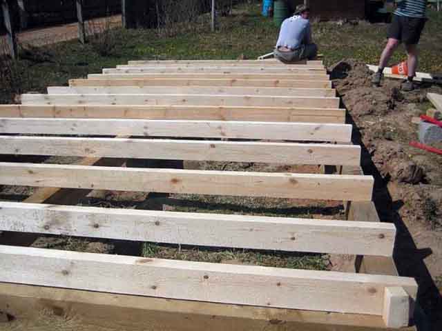 Следующим этапом будет установка бетонных блоков, которые мы прячем под двойным слоем рубероида и переходим к работе с брусьями. Из них необходимо сделать основу всей конструкции. Не забудьте о водном уровне, при помощи которого мы должны выровнять будущий дом. Сами брусья укладывают на бетонные блоки и связывают их между собой скобами или листовым металлом. Не забываем прикрепить деревянную основу к бетонным блокам. После выполнения этих работ, еще раз проверяем уровни.