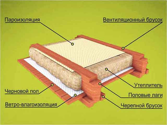 • утеплитель, в виде минеральной ваты, следует разместить в промежутки образовавшийся между лагами. Анализируемый утеплитель более актуален для деревянных строений, однако стоит учесть, именно минеральная вата способна насыщаться влагой, что приводит к потере утепляющих характеристик. Чтобы не допустить такой ситуации следует оставить зазор небольшого размера между чистовым половым покрытием и мембраной или уложить поверх утеплителя материал способный защитить минеральную вату от контакта с водой, к примеру «Изоспан».