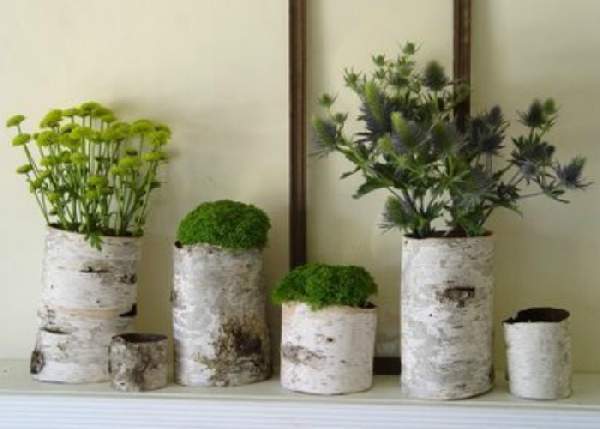 Напольную вазу из пластиковых бутылок можно сделать в разных стилях. Например, отличным вариантом может стать обычный пятилитровый бутыль со срезанной горловиной, обёрнутый в тонкую берёзовую кору.