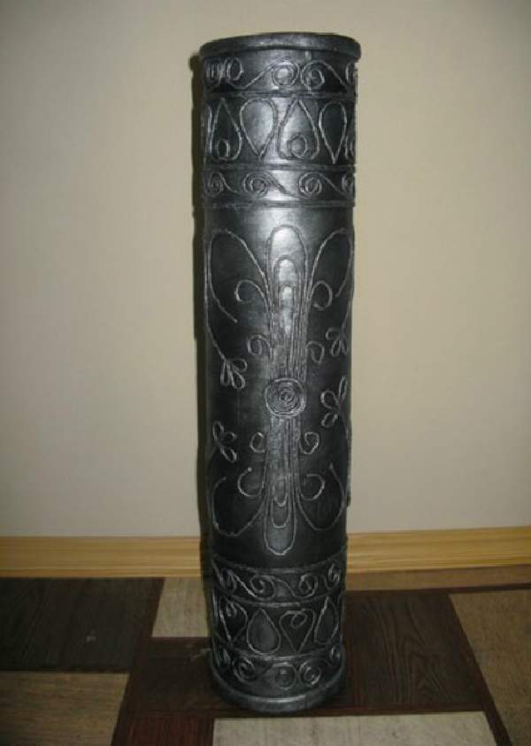 Идея: для декора напольной вазы из трубы используйте старые капроновые чулки. Вымочите их в ПВА, хорошенько выжмите, а потом оденьте на подготовленную трубу. Распределите по всей площади, создавая фигурные складки. Дайте заготовке подсохнуть, а потом окрасьте и задекорируйте по своему вкусу.