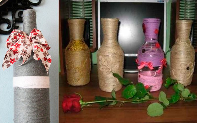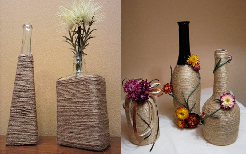 Бечевка – идеальный материал для украшения ваз, бутылок и других мелких элементов декора. Также ее можно комбинировать с другими материалами: пуговицами, тканью, стразами, искусственными цветами. Для того, чтобы закрепить бечевку или нитку на поверхности сосуда, обычно берется клей ПВА. Но некоторые умельцы также используют «Клей-момент» или термоклей.