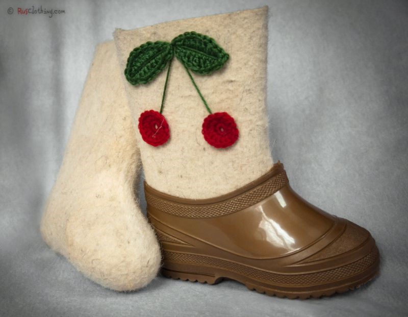 Еще один вариант для украшения девичьих валенок — вязание. Можно связать крючком декор для голенища или небольшую брошь.