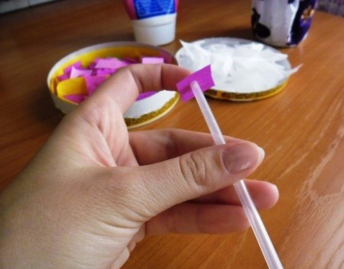 5. Воткните стержень в серединку прямоугольника (бумагу нарежьте на мелкие кусочки одинакового размера) и затем скомкайте.