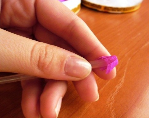 3. Теперь подготовьте для работы следующие материалы, это клей, лучше брать что-то вроде жидких гвоздей, им удобнее работать. Затем понадобится бумага гофрированная или креповая и стержень от гелевой ручки.