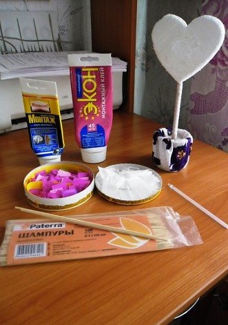 2. Далее возьмите палочку или карандаш, для этой цели очень хорошо подходят палки для шашлыков и воткните ее в сердечко. Палочку спрячьте используя декоративную ленточку. После вставьте палочку в баночку, ее тоже нужно украсить, оберните посуду тканью или бумагой, вообщем подручными средствами, даже можно использовать пластилин.
