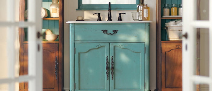 Выбирая мебель для ванной комнаты в стиле Прованс, отдавайте предпочтение оригинальным предметам, четко вписывающимся в этот стиль. Комод или тумбы должны быть из натурального дерева, не зацикливайтесь на современных имитациях, если у вас есть возможность приобрести настоящую вещь. Прованс — это раритетная мебель из массива, потертая и растрескавшаяся. Если нет возможности приобрести такую мебель, всего этого можно достигнуть техникой искусственного старения.