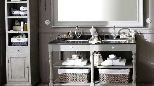 Характерной чертой интерьера французских деревень является присутствие в них дерева и ковки. В своей ванной комнате вы можете использовать деревянные полки. На них удобно раскладывать аккуратно свернутые в рулоны или сложенные стопками полотенца. На стене может появиться кованая вешалка. На ней комфортно будет оставлять одежду. Белье, подготовленное для стирки, нужно собирать плетеные корзины. В уголке с умывальником и комодом может появиться скамейка из лозы. Вся присутствующая мебель, должна поражать массивностью и показной старостью. При отсутствии возможности обставить ванную действительно раритетными экземплярами, вы можете искусственно состарить абсолютно новые мебельные предметы.